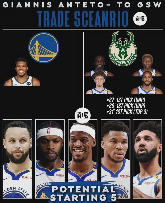 之前有美媒建议勇士打包送出追梦格林+库明加+波杰姆斯基+穆迪+3个首轮签,也许就能打动雄鹿管理层挖来希腊怪兽。